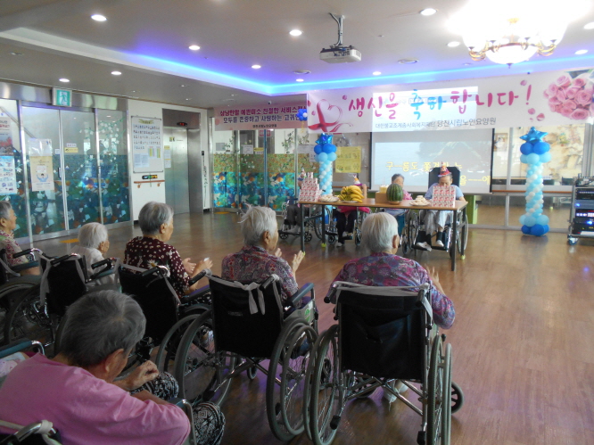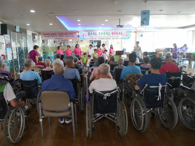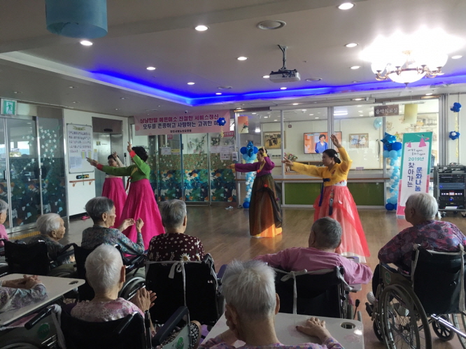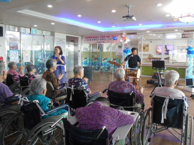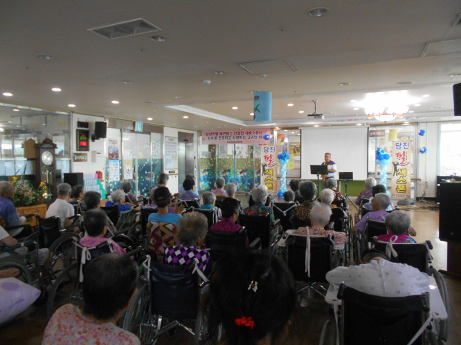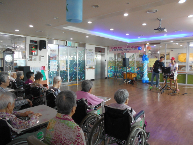 이번달은 샘물봉사단 ,고대교회예배, 당진필 색소폰공연, 재능나눔협회 공연, 찾아가는 문화나눔 공연, 원훼밀리다문화센터 공연, 생신잔치를 했습니다.