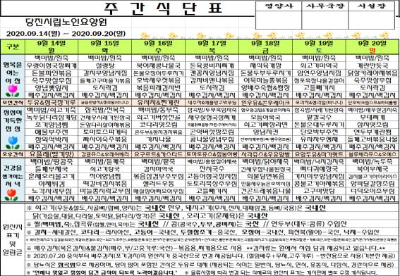 ♤ 2020. 09. 14 ~ 2020. 09. 20 식단표 ♤