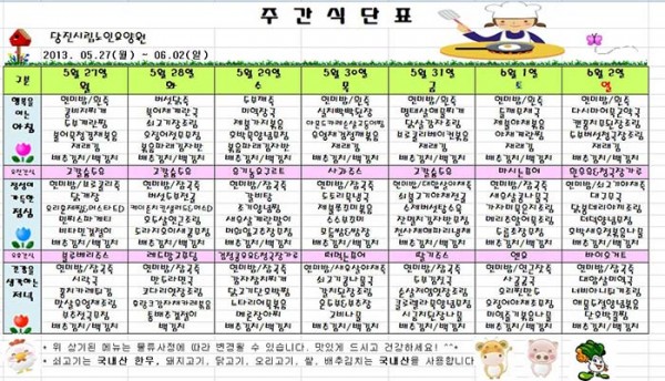2013년 5월 다섯째 주 식단표입니다~~ 페이지 정보 작성자 운영자 댓글 0건 조회 918회 작성일 13-05-31 14:42 본문 5월 5주차 식단표 ^^ 목록 글쓰기 이전글2013년 6월 첫째 주 식단표입니다~~ 13.05.31 다음글2013년 5월 넷째 주 식단표입니다~~ 13.05.31 댓글목록 댓글목록 등록된 댓글이 없습니다.
