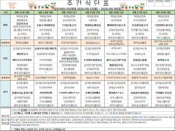 *2025.09.22~2025.09.28* 주간식단표를 게시합니다.