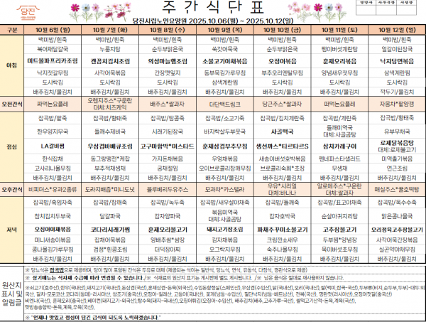 *2025.10.06~2025.10.12* 주간식단표를 게시합니다.