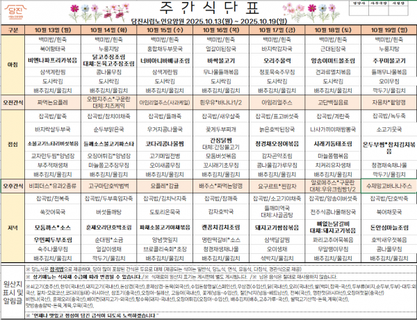 *2025.10.13~2025.10.19* 주간식단표를 게시합니다.